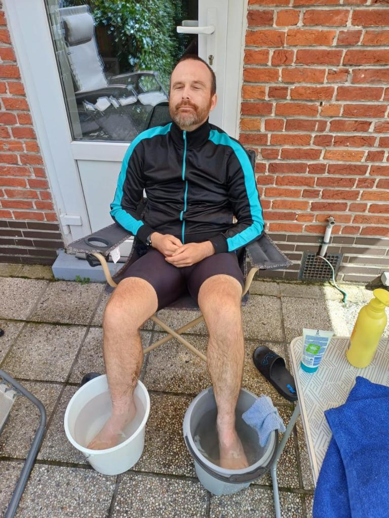 Aan de finish zag ik een aantal deelnemers instorten. Op een terras werden ze in een aluminiumdeken gewikkeld. Wat vermoeid keek ik naar dit aandoenlijk tafereel.