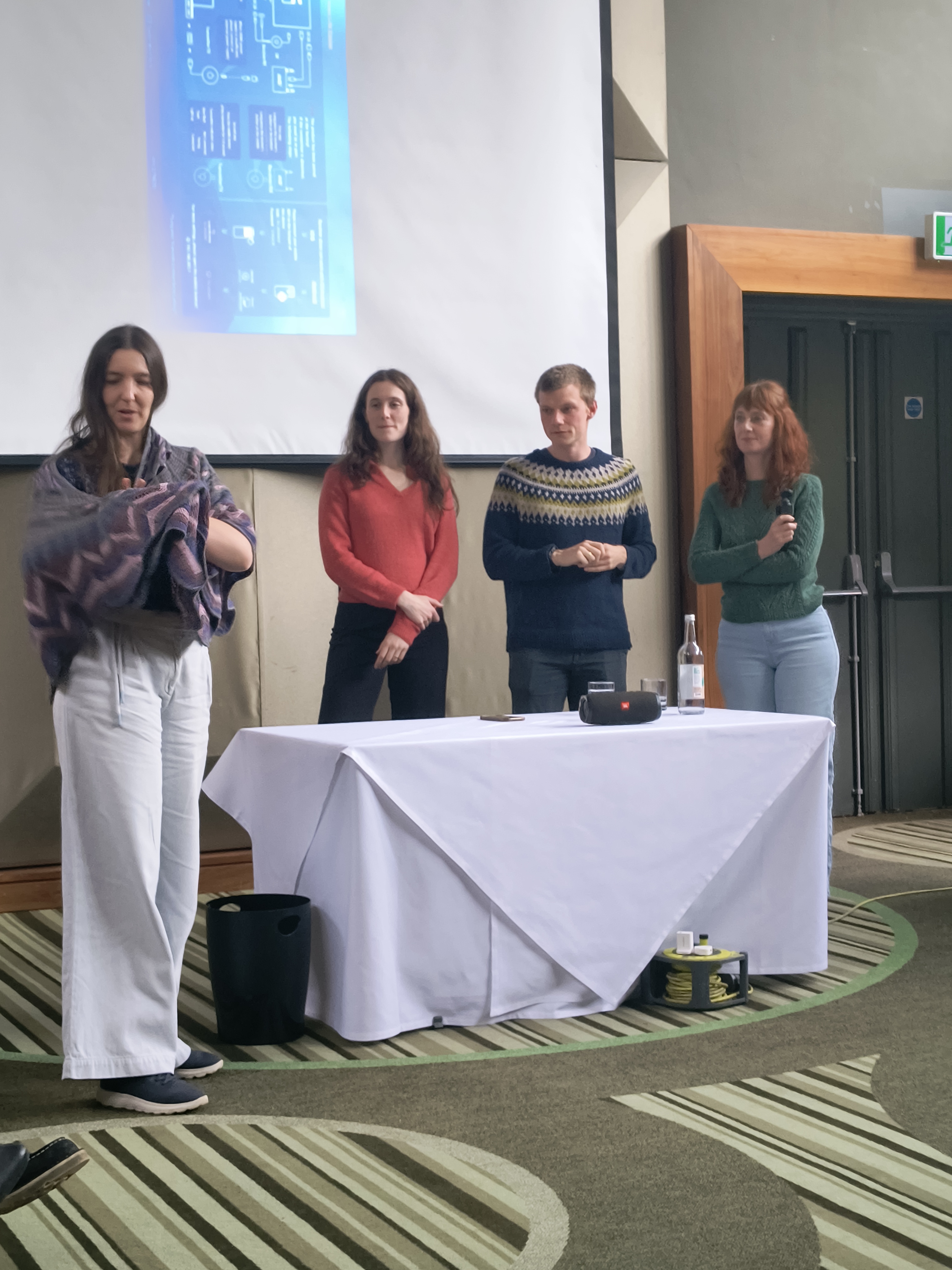 De knitting-retrait sloot af me een heuse modeshow waar de deelnemers hun creaties konden showen op de tonen van Queen en Abba. Ineke toonde trots haar trouwsjaal (ontwerp van Stephen West).